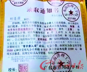 江门市招生办有关负责人介绍,目前考生接到的冒牌录取通知书大致有四类:一是成人高校的录取通知书;二是大学举办的高教自考助读班的;三是个别高职学校的;第四类就是纯粹意义上的假录取通知书。