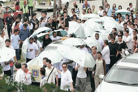 朱丽倩父亲出殡,以雨伞阵来保护重要人物刘德华,都算是丧礼上的奇景。