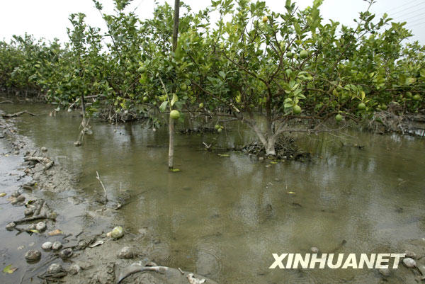 屏东县里港乡的受灾果园里满是积水(8月29日摄)。 台湾风灾已经过去三个星期,屏东县里港乡的农田、果园、鱼塘里仍然堆着从高屏溪上游冲来的漂流木与淤泥。新华社发 |