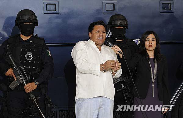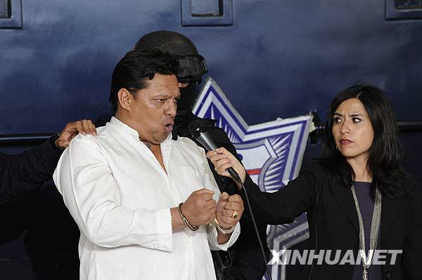 9月9日,在墨西哥首都墨西哥城国际机场,劫机嫌疑人(前左)接受采访。当日,一架从墨西哥坎昆市飞抵墨西哥城的波音737客机遭到劫持,目前机上所有104名乘客和全部机组成员均被释放,警方已将劫机嫌疑人逮捕。 新华社记者 鲍菲菲 摄
