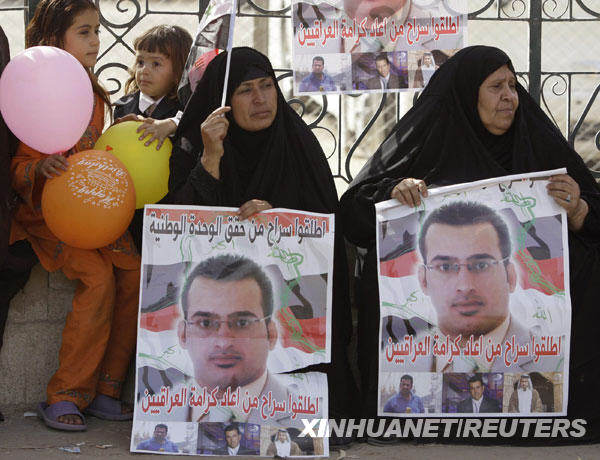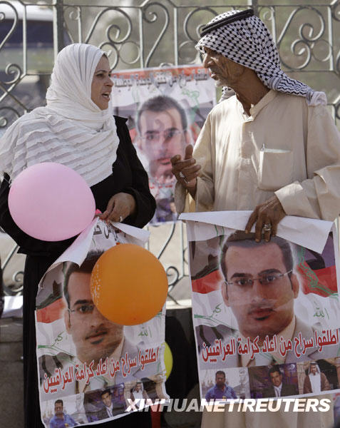 9月14日,在伊拉克首都巴格达,朝美国时任总统乔治·W·布什扔鞋抗议的伊拉克记者蒙塔兹·扎伊迪的亲友等候扎伊迪的获释。但扎伊迪当天因为手续未完备未能按期获释,不得不在监狱里多待一天。新华社/路透