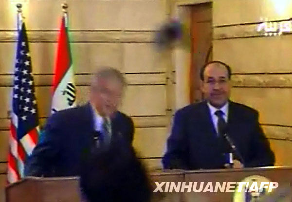 9月14日,朝美国时任总统乔治·W·布什扔鞋抗议的伊拉克记者蒙塔兹·扎伊迪因为手续未完备未能按期获释,不得不在监狱里多待一天。这是2008年12月14日扎伊迪向布什扔鞋时伊拉克总理马利基(右)替布什遮挡的资料图片。新华社/法新
