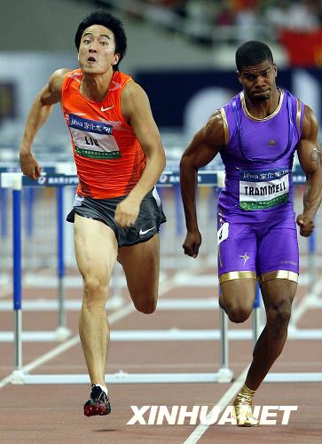 9月20日,中国选手刘翔(左)在比赛中。当日,在2009上海国际田径黄金大奖赛男子110米栏比赛中,刘翔跑出和冠军特拉梅尔(右)同样的13秒15,获得亚军。这是刘翔在北京奥运会退赛后首次参加比赛。新华社记者凡军摄