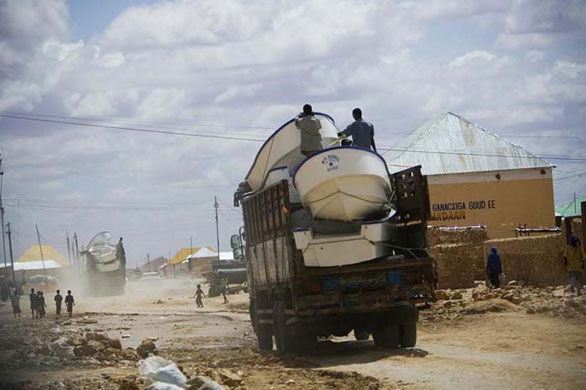 2008年10月29日,索马里总统给国外军队“开绿灯”,允许他们在索马里国境范围内打击海盗。作为回应,海盗决定和军队放手一搏。图为海盗们的卡车运输车队,每辆卡车上都载有5艘快艇,他们是前往索马里中部城镇霍比亚(Hobyo)的海岸,接应同伙。 |