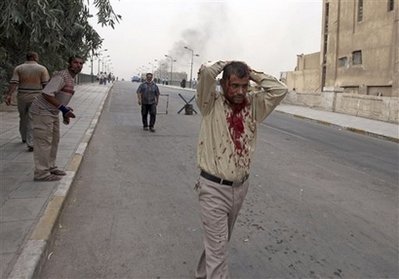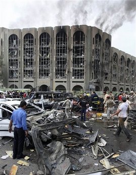 两起自杀式炸弹袭击相隔不到几分钟,大约发生在当地时间早上10点半。爆炸现场浓烟四起,数十辆车辆被炸毁,污水管道也被炸坏,附近污水横流。在爆炸现场上空几架直升机正在盘旋,而数十辆悍马军车在现场附近的街道巡逻。