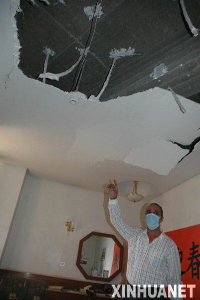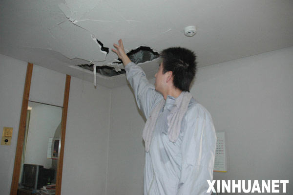 10月25日,新华社记者付一鸣在查看分社房间损毁情况。新华社记者高山摄