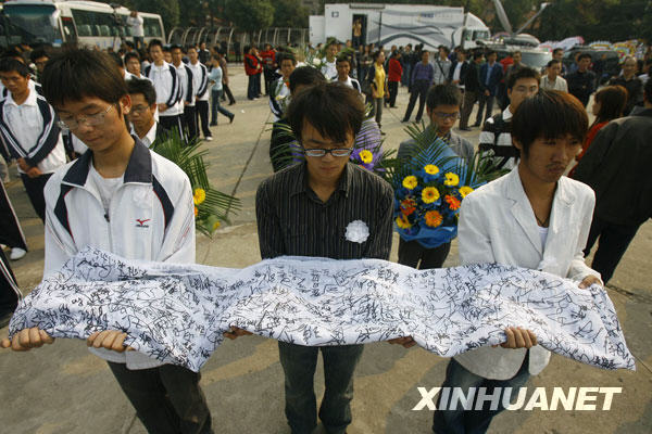 10月28日,长江大学学生在追悼会上送上纪念牺牲校友的万人签名条幅。新华社发(陈卓 摄)