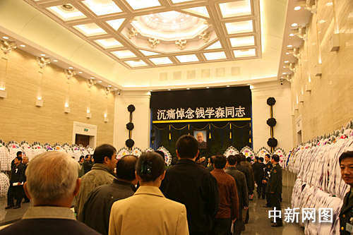各界群众在八宝山的灵堂内向钱学森的遗体告别。