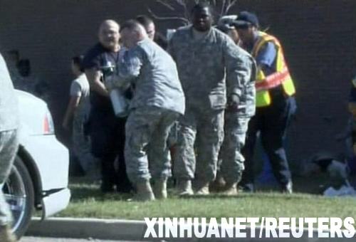 这张11月5日发布的视频截图显示,在美国得克萨斯州胡德堡陆军基地,救援人员在运送伤者。据美国军方说,5日发生在胡德堡陆军基地的枪击案死亡人数已上升至13人,另有30多人受伤。新华社/路透