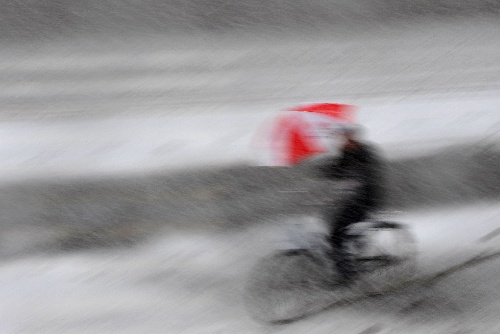 银川,2009年11月10日 银川迎来首场降雪 11月10日,银川市街头,市民在雪中骑行。 当日,宁夏银川市迎来今冬首场降雪。气温下降8摄氏度左右,并伴有大风。 新华社记者 王鹏 摄