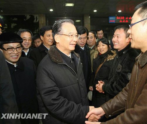 11月12日,中共中央政治局常委、国务院总理温家宝赶赴河北暴雪地区指导工作。图为抵达石家庄后,温家宝前往火车站候车室看望旅客。新华社记者刘卫兵摄