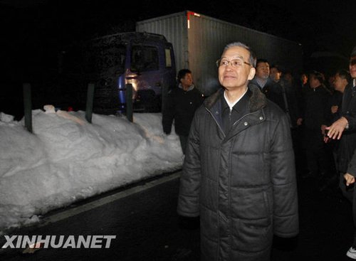 11月12日,中共中央政治局常委、国务院总理温家宝赶赴河北暴雪地区指导工作。图为温家宝在石太高速公路河北山西两省交界处察看雪情。新华社记者刘卫兵摄