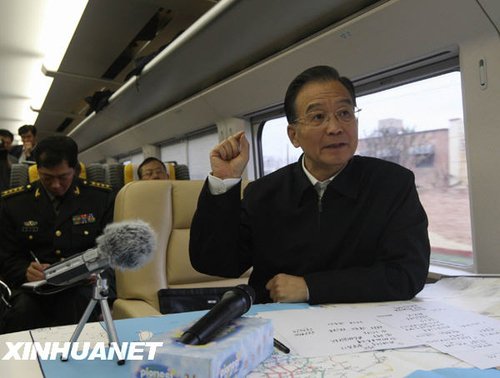 新华网石家庄11月12日电 (记者赵承、李斌)12日下午,中共中央政治局常委、国务院总理温家宝赶赴河北受暴雪影响地区指导工作。他在前往石家庄的火车上召开现场办公会,听取有关部门的工作汇报。他强调,要加强领导,科学组织,狠抓落实,做好应对暴雪的各项工作,实现保民生、保生产、保运输的目标。
