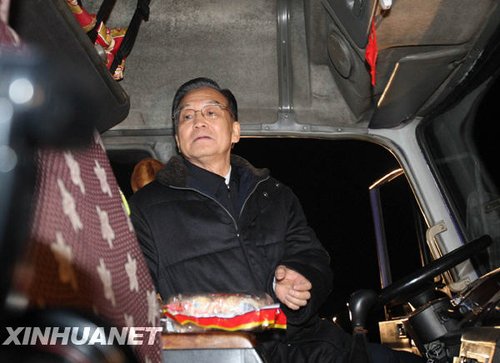 图为在石太高速公路河北山西两省交界处,温家宝登上一辆因暴雪滞留的大货车,了解司机的生活保障情况。新华社记者刘卫兵摄