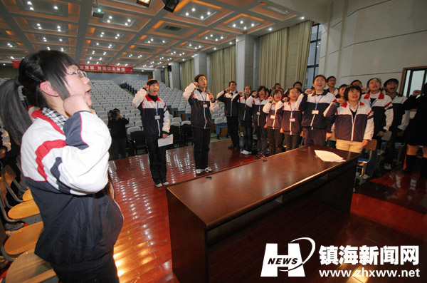 中兴中学高二(1)班学生在学习金时荣主题班会上宣誓:学习金时荣老师优秀品格,现在学好文化知识,将来为祖国的繁荣昌盛作贡献。
