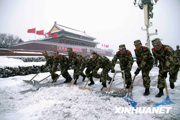 当日,北京普降大雪。部分武警官兵上街铲除积雪,方便市民和游客出行。新华社发(陈晓根 摄) |