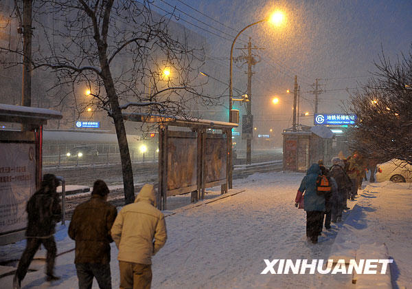1月3日,行人在街头冒雪行进。当日,北京迎来2010年的第二场降雪。新华社记者 鲁鹏 摄 |