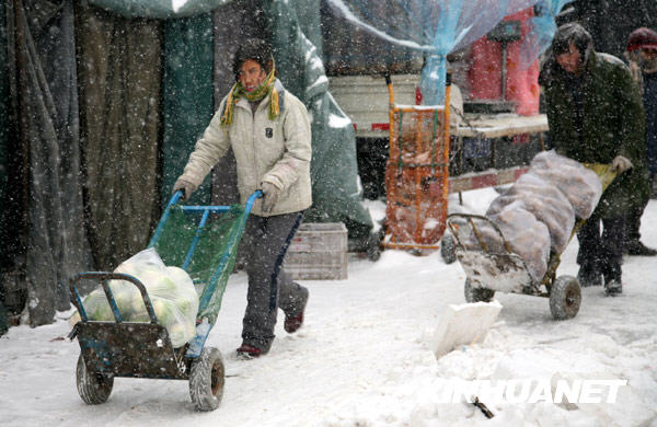 当日,北京普降大雪。京郊怀柔区南华集贸市场一派忙碌景象,经营者们冒雪开市,为群众供应各类蔬菜。新华社发(卜向东 摄) |