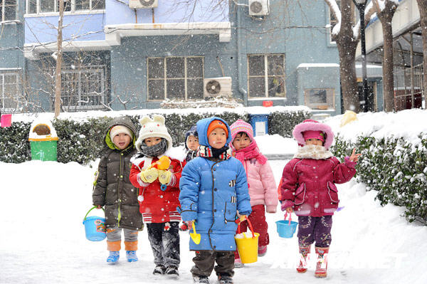 1月3日,几名“装备齐全”的小朋友在北京石景山一住宅小区内的雪地里“集结”,准备出发去玩雪。新华社记者 何俊昌 摄 |