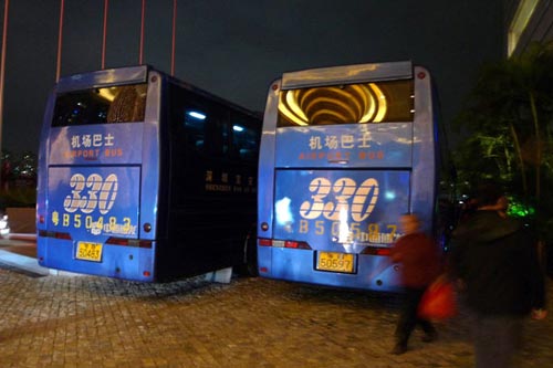 在深圳凯宾斯基酒店门前,停着两辆机场大巴作为包车。