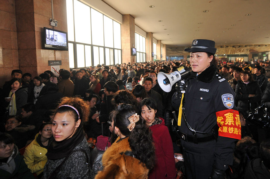 1月19日,一位民警在太原火车站候车厅维持秩序。随着春运的临近,太原铁路公安部门提前进入春运状态,增派警员,加大各进站口、售票厅的检查力度,强化防控责任,确保旅客平安顺利返乡。