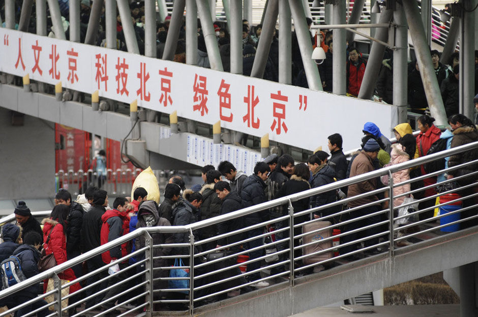 2010年1月20日,北京春运第一天的西客站。西站附近的天桥上挤满旅客。当天,北京铁路局根据北京地区客流特点宣布,从1月20日起北京铁路运输部门进入春运状态,这比全国春运提前了10天,春运将一直持续到3月10日。
