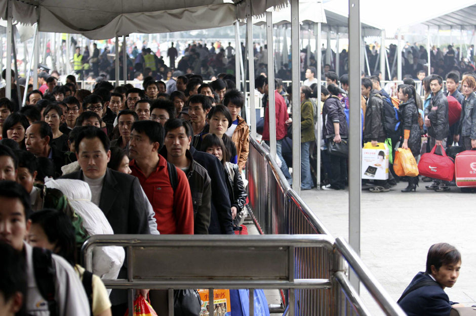 1月20日,旅客在广州火车站进站口排队进站。当日,广州火车站迎来以学生、农民工和探亲流为主的客流高峰。
