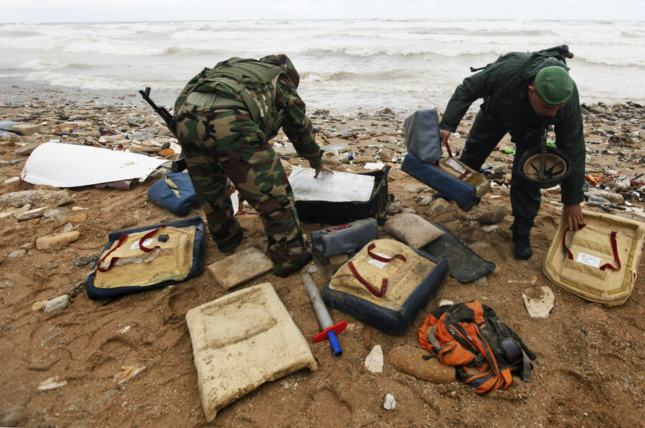 黎巴嫩士兵在海边捡拾失事飞机残骸