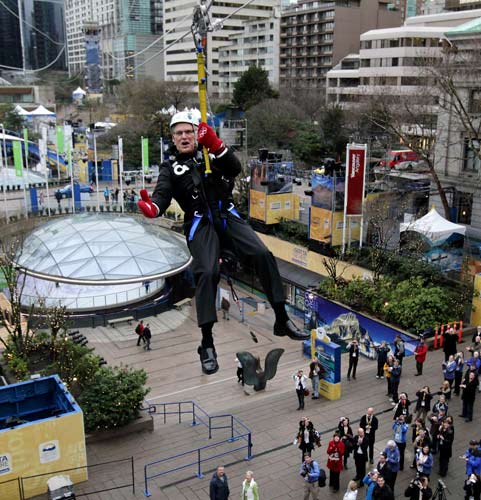 新浪体育讯 北京时间2月6日,2010年温哥华冬奥会还有一周的时间就将正式拉开帷幕,主办城市温哥华的大街小巷已经充满了浓郁的冬奥气息。各大场馆为比赛做准备的工作人员目前进入了紧张的冲刺阶段,而已经入住奥运村的各国队员们也展示出赛场外可爱的一面。图为英国人戈登-坎贝尔在一条滑索上表演,这条方便行人穿越罗本森广场的索道将在温哥华冬奥会期间免费向路人开放使用,当然你需要足够的胆量。(图片来自路透)