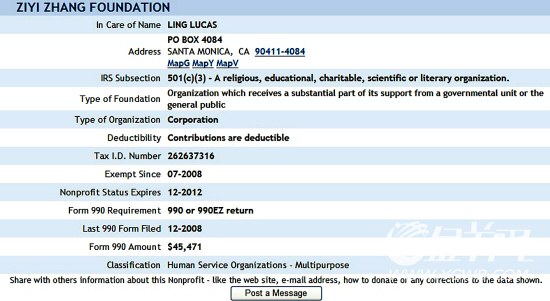章子怡陷“诈捐门” 网友曝光其基金在美注册截图