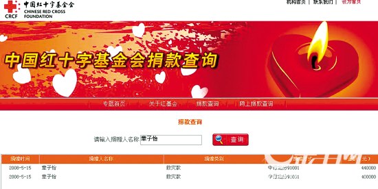 红十字基金会捐款查询系统显示:章子怡共计捐款84万元。