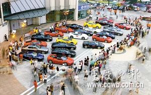 昨日,观音桥北城天街,市民在豪车旁围观 重庆商报 记者 张路桥 摄
