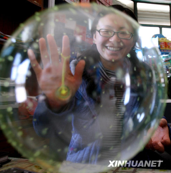 全国人大代表毕红珍在超市闲暇时玩气球(2月24日摄)。新华社记者陈建力、多蕾报道