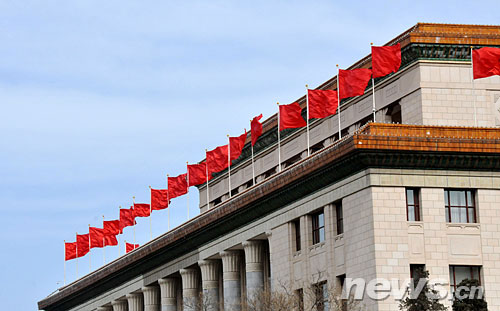 2010年3月2日,人民大会堂红旗昭展,喜迎即将召开的全国两会。新华网 翟子赫 摄