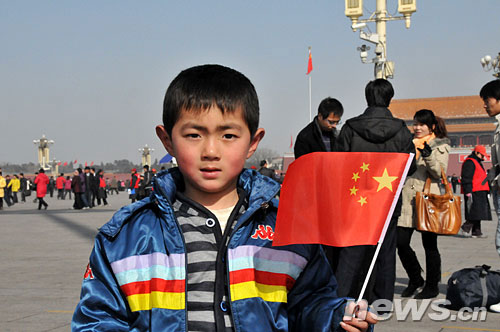 2010年3月2日,一名小游客手持国旗游览天安门广场。十一届全国人大三次会议、全国政协十一届三次会议将分别于3月5日和3月3日在京开幕。新华网 翟子赫 摄