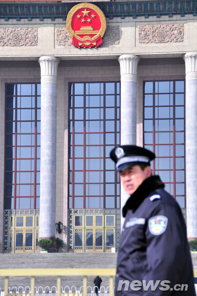 全国“两会”安保方案日前启动,北京重点地区的警力全面升级,其中天安门地区、主会场外围、各代表驻地成为安保的重中之重。图为在人民大会堂前执勤的警察。新华网 孙巍 摄