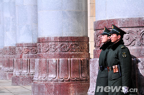全国“两会”安保方案日前启动,北京重点地区的警力全面升级,其中天安门地区、主会场外围、各代表驻地成为安保的重中之重。图为在人民大会堂执勤的武警。新华网 孙巍 摄