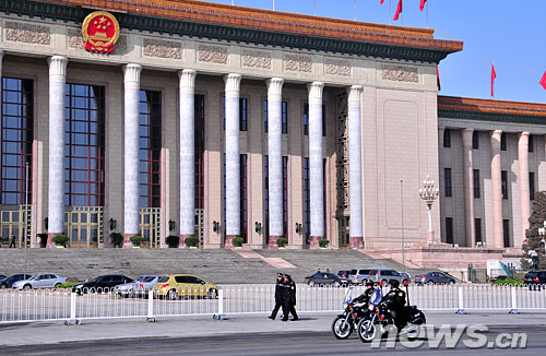 全国“两会”安保方案日前启动,北京重点地区的警力全面升级,其中天安门地区、主会场外围、各代表驻地成为安保的重中之重。图为在人民大会堂前巡逻的警察。新华网 孙巍 摄