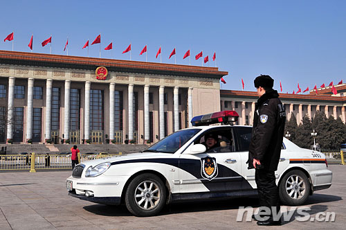 全国“两会”安保方案日前启动,北京重点地区的警力全面升级,其中天安门地区、主会场外围、各代表驻地成为安保的重中之重。图为在人民大会堂前执勤的警车。新华网 孙巍 摄
