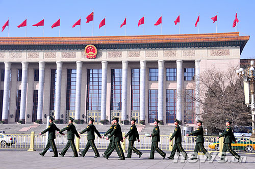全国“两会”安保方案日前启动,北京重点地区的警力全面升级,其中天安门地区、主会场外围、各代表驻地成为安保的重中之重。图为在天安门广场执勤的武警。新华网 孙巍 摄
