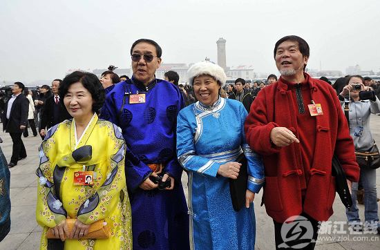 3月3日下午,全国政协十一届三次会议在北京隆重开幕。浙江省全国政协委员何水法(右)、鞠雅莲(蒙古族、右二)身着节日盛装和少数民族委员一起兴高采烈地迈入人民大会堂。 吴海森 摄