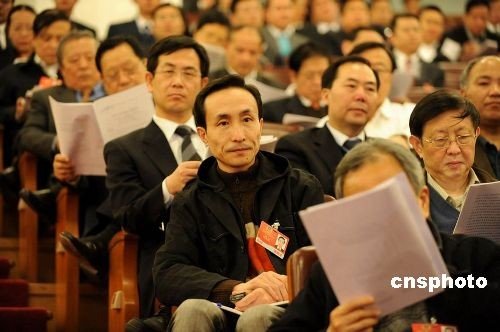 资料图:2009年全国两会期间,演员巩汉林在听会。中新社发于润杰摄