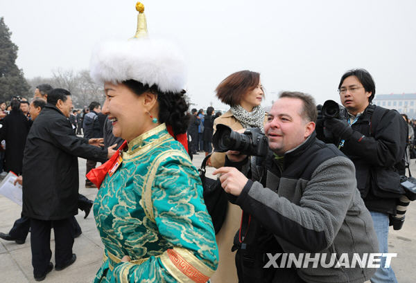 3月3日,全国政协十一届三次会议在北京人民大会堂开幕,3000多名记者云集北京采访。这是大会开幕前,一位外国记者跟拍一位身着少数民族服装的全国政协委员。新华社记者 陈树根 摄