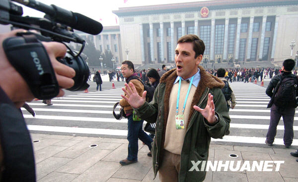 这是大会开幕前,一位外国记者正在人民大会堂前出镜。新华社记者 郭晨 摄