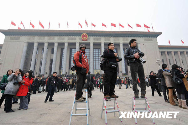 这是大会开幕前,3位摄影记者在人民大会堂东门外广场采访。新华社记者 黄孝邦 摄