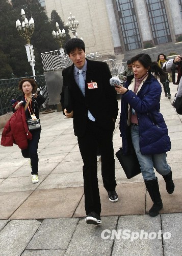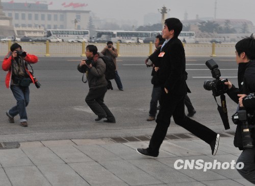 3月3日,全国政协十一届三次会议在北京人民大会堂开幕。刘翔委员成为记者追逐的焦点,但以速度见长的刘翔一路小跑,轻松甩开记者围堵。