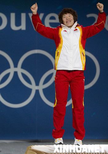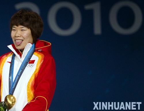 2月21日,中国选手周洋在颁奖仪式上。当日,冬奥会短道速滑女子1500米颁奖仪式在温哥华不列颠哥伦比亚体育馆举行,为中国体育代表团赢得本届冬奥会第三枚金牌的周洋登上冠军领奖台。新华社发(魏征摄)