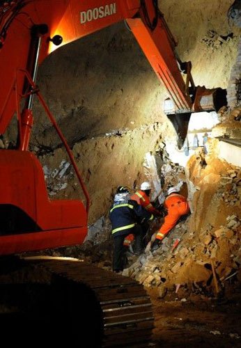 3月10日晚,当地政府和消防人员正全力营救被埋人员。新华社记者陶明摄