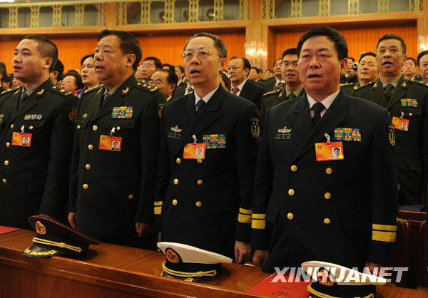 3月14日,第十一届全国人民代表大会第三次会议在北京人民大会堂举行闭幕会。这是全国人大代表在高唱国歌。新华社记者 陈树根摄