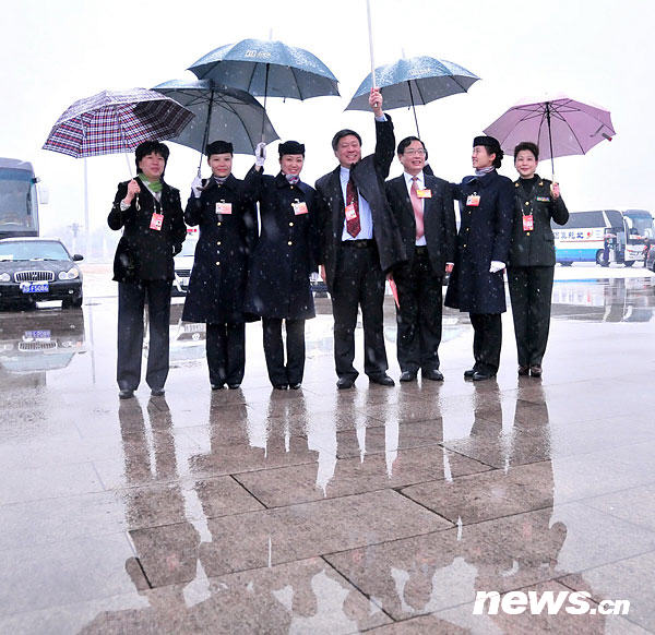 两会特写:雪中情 伞下情